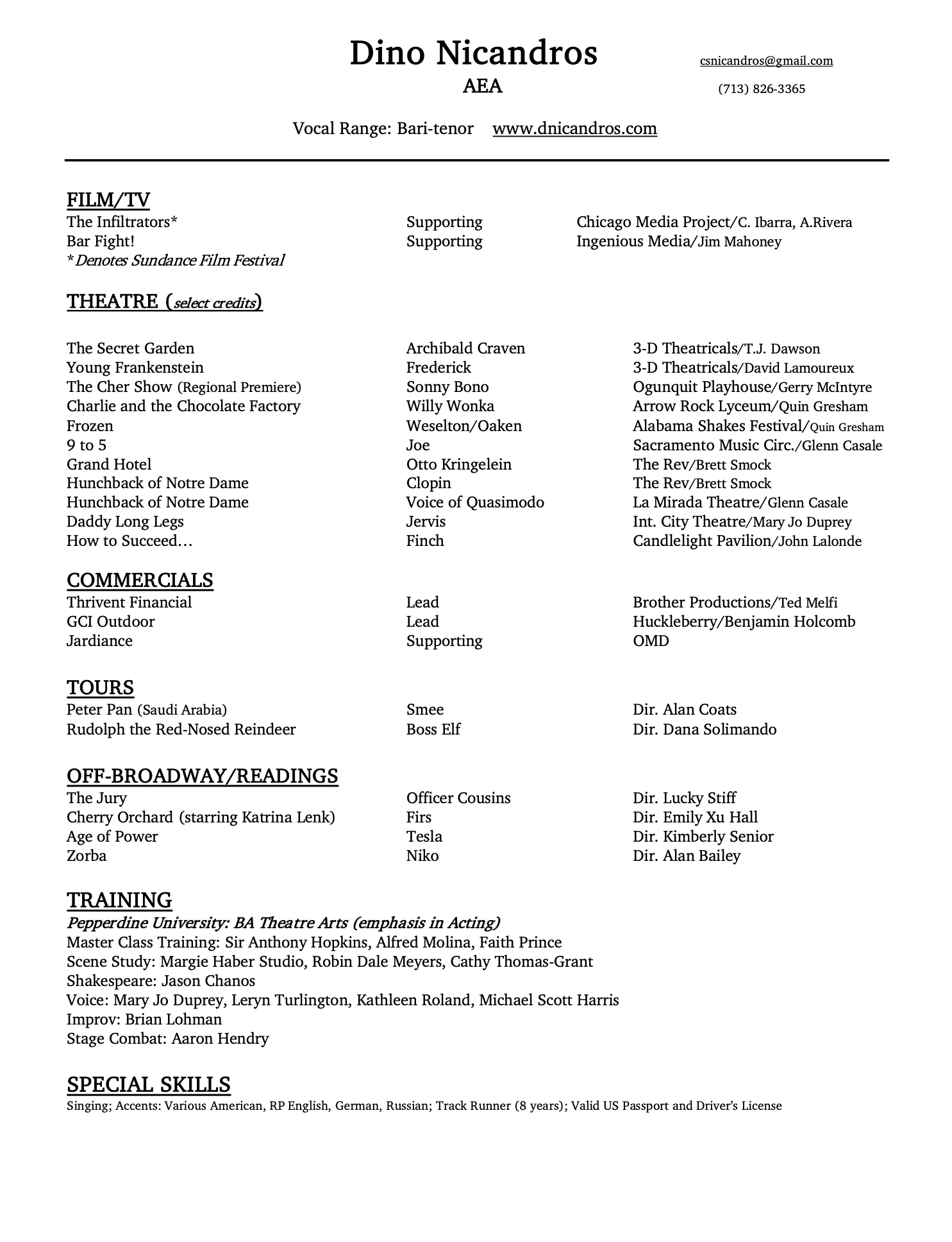 A native of Houston, Texas, Dino moved to Los Angeles, where he pursued his education at Pepperdine University. He earned a Bachelor of Arts degree (cum laude) in Theatre Arts, Emphasis in Acting and was the recipient of the university’s John Raitt Award for Outstanding Contribution to the Performing Arts. After a decade of living and working in California, Dino has recently made New York home.